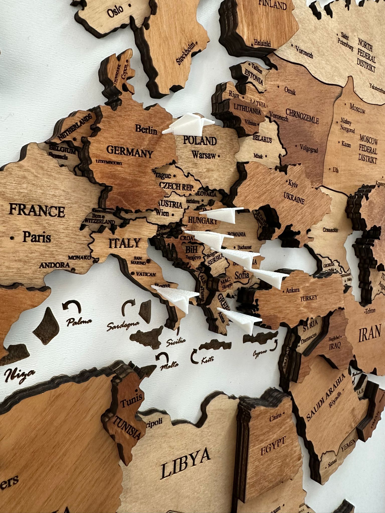 Dodatni set od 40 pinova u obliku aviončića za označavanje putovanja na 3D drvenoj mapi sveta. Kompatibilno sa svim modelima mapa iz serije 3D drvena mapa sveta.